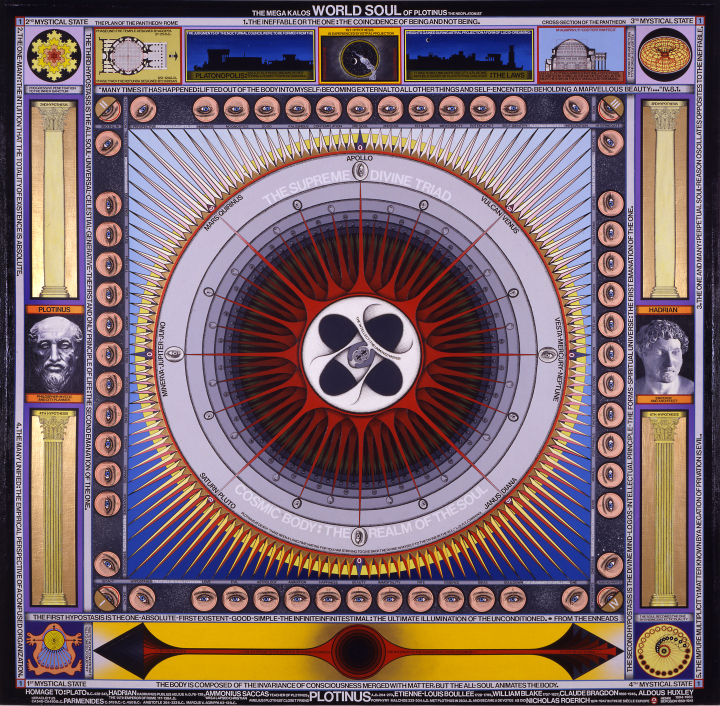 “The World Soul of Plotinus,” by Paul Laffoley, 2001. Oil, acrylic, and vinyl lettering on canvas.Paul Laffoley, courtesy of Kent Fine Art, New York.